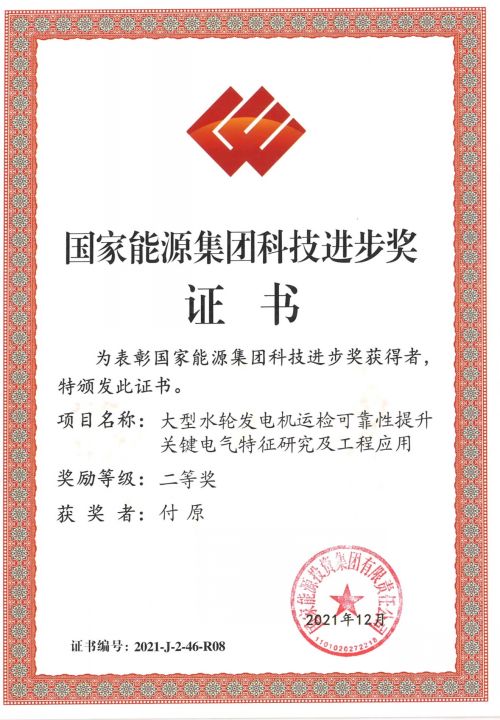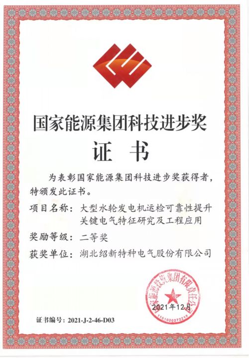 對湖北紹新特種電氣股份有限公司及付原、傅祺兩名同志,在《大型水輪發(fā)電機運檢可靠性提升關鍵電氣特性研究及工程應用》項目完成中,所發(fā)揮的重要作用、取得的突出成績給予獎勵,并頒發(fā)國家能源集團科技進步二等獎證書。